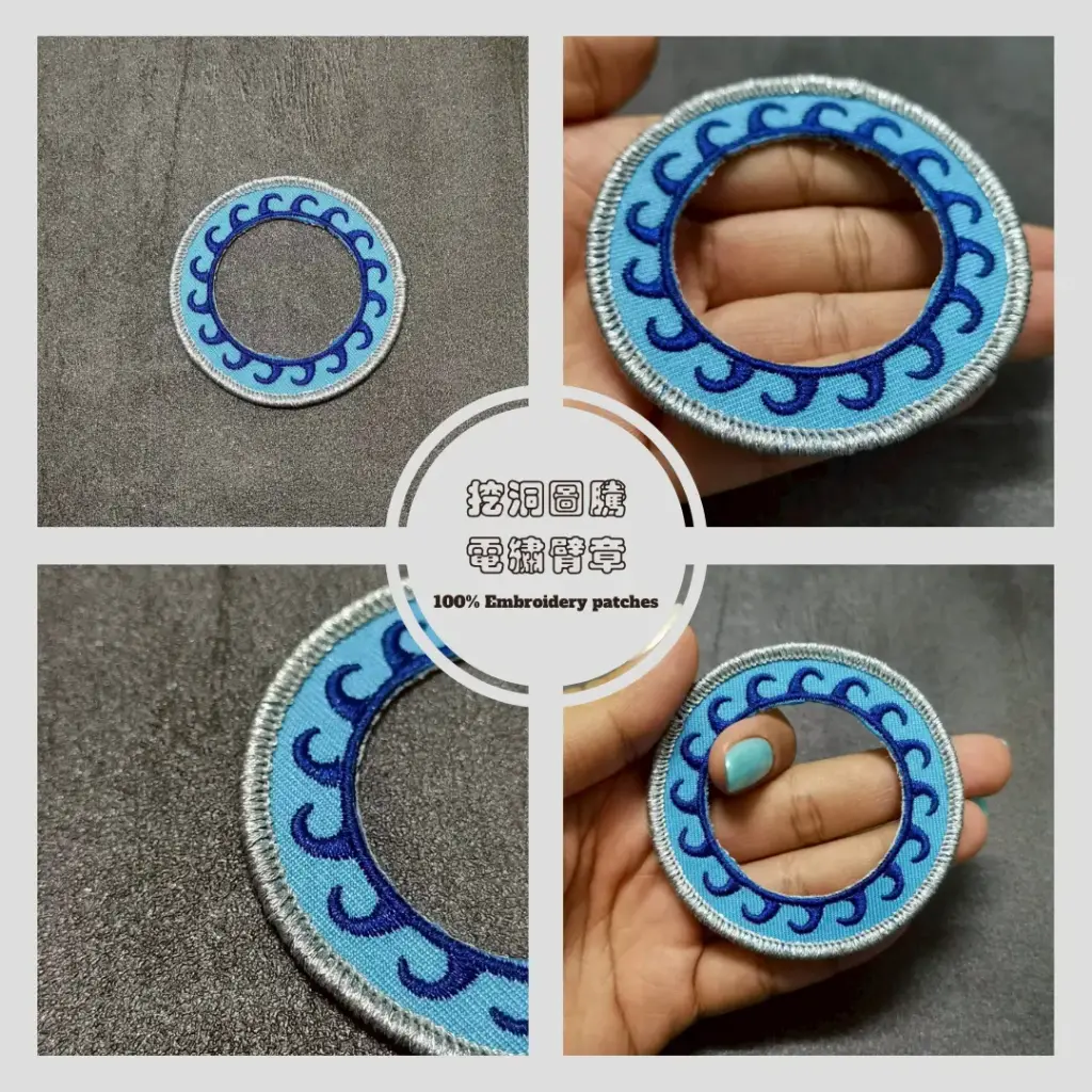 全客製產品優點就是沒有形狀的限制,隨心所欲地發揮你的天馬行空,此款圓形臂章雖看起來簡單,但搭配客人巧思,中間挖洞配上海浪圖騰,再配上銀蔥線包邊,為簡單的臂章添上一抹亮色,想要客製專屬臂章就找金帥。